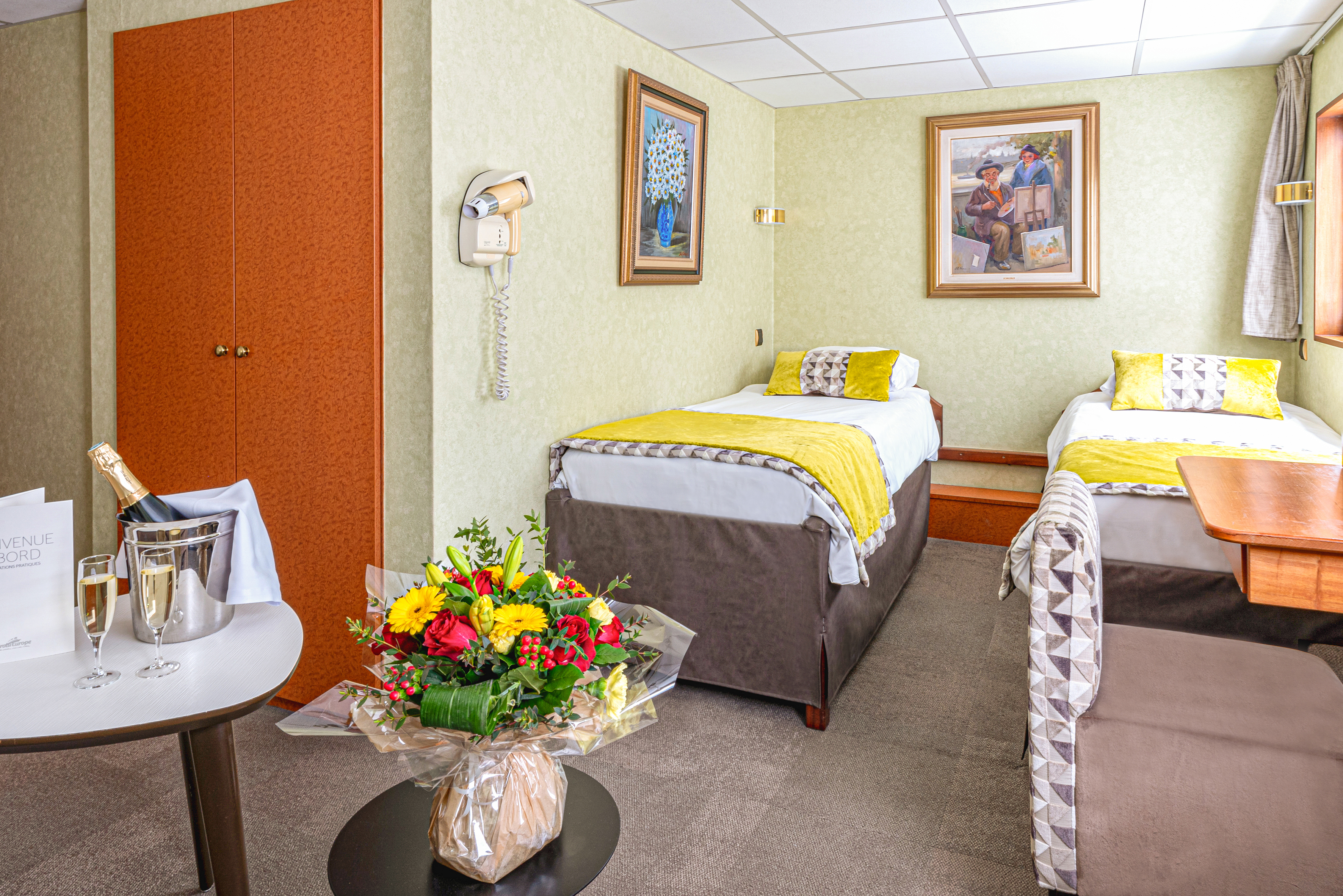 På elvecruiset vårt bur vi svært godt på MS France (4 stjerner), ein hyggeleg elvebåt med 78 lugarar som alle er utvendige. Lugarane har også bad med dusj, hårtørkar, TV, safe og aircondition. Alle måltida om bord med drikke er inkluderte. Vi har heile båten berre for Fotefar, så dette blir verkeleg ei unik kulturell og musikalsk oppleving på mektige Donau.